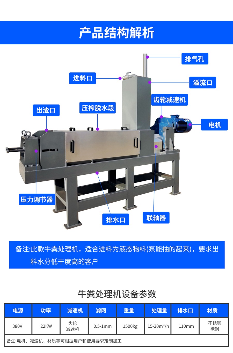 ?固體收集和液體排放?:分離出的固體部分被收集并送入儲存或后續(xù)處理設(shè)備,如發(fā)酵制成有機(jī)肥料;而液體部分則可能經(jīng)過進(jìn)一步處理或直接用于灌溉農(nóng)田等用途。